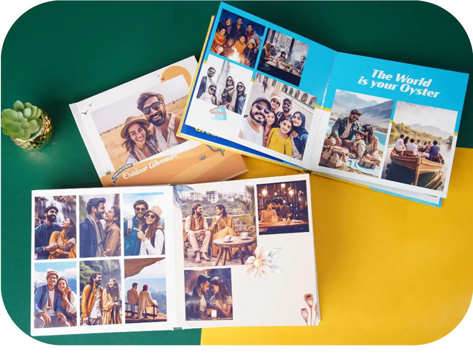 Color Kahar Themed Photobooks: A fresh take on the classic photo albums. Select a theme, drop in your favorite photos and voila! You’ve got yourself a photobook with stunning artwork and captions in no time. From love stories to thrilling travel logs and family moments, we have exclusive themes for all occasions designed by our experts. A perfect gift for your loved ones or a keepsake for yourself made with the magic of memories. Available in 8 x 8 inch Square and A4 sizes